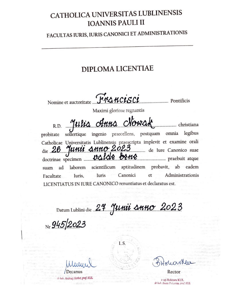W czerwcu 2023 r. ukończyłam z wyróżnieniem studia z prawa kanonicznego na